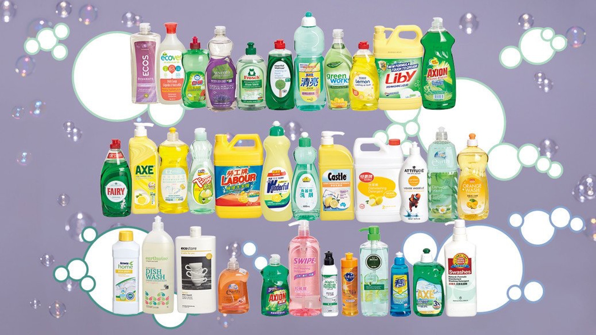 消委會於 2018 年曾測試過 35 款洗潔精,當中包括 23 款「一般」、4 款「濃縮」及 8 款「超濃縮」配方的產品,容量介乎 230 ml—2 kg。而每款的售價由約 $11—$95 不等。
