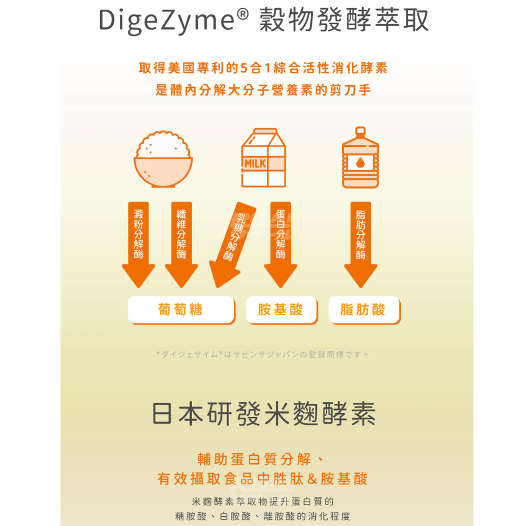 • 嚴選日本研發米麴酵素,強化蛋白質分解,有利多元胺基酸攝取與吸收。