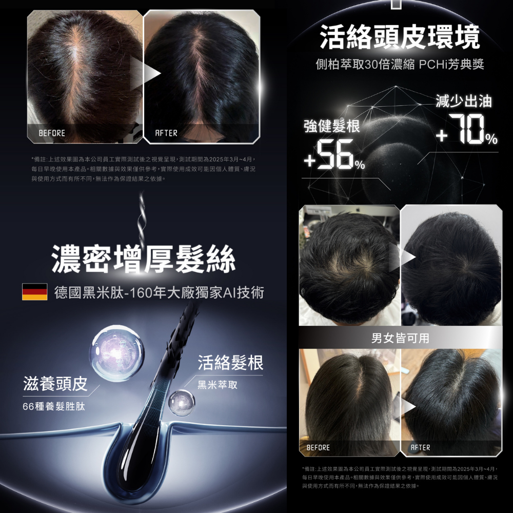 • 德國泛醇x黑米肽,修護保濕頭皮
